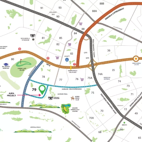 The Aura 79 located in Sector 79, Gurgaon is a high end residential project by the Aura Developers who have also provided a wellness and oriented design of the residence building. The development is spread across 4.6 acres with 5 high rise towers, accommodating around 500 apartments with a configuration of 2.5 BHK, 3 BHK and 3.5 BHK. The project focuses on the open green areas, the landscaped gardens and the social amenities, such as the clubhouse, gym, infinity pool, jogging tracks and playground for children. Located strategically close to Dwarka Expressway, NH 48 and major educational, health and retail centers, Aura 79 is a blend of connectedness and comfort. It is constructed to the highest standards of construction, furnished with modern facilities, and located in a safe space and is aimed at the segment of families and investors interested in modern urban living in New Gurgaon.