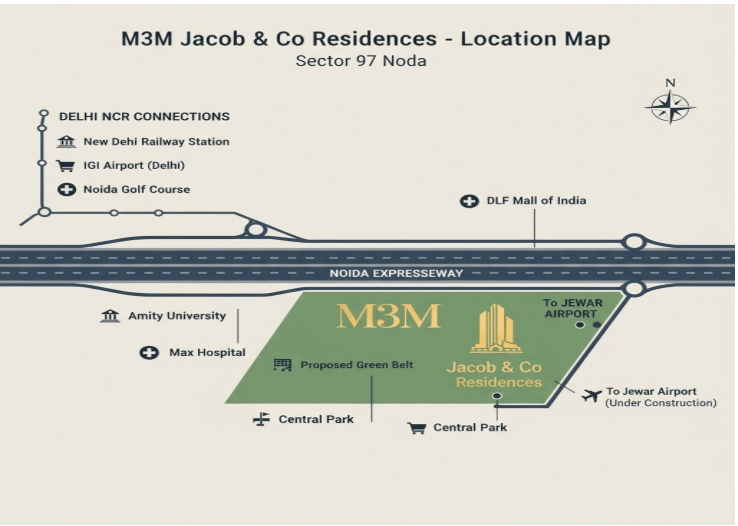 M3M Jacob & Co. Residences is a luxury residential project by M3M India, designed to offer an exclusive lifestyle combining elegance, comfort, and world-class amenities. Inspired by the opulence and craftsmanship associated with the Jacob & Co. brand, the project features meticulously designed apartments with premium finishes and contemporary architecture. Residents can enjoy a range of recreational and lifestyle amenities, green landscapes, and a secure, gated community environment. Strategically located in a prime area, M3M Jacob & Co. Residences ensures excellent connectivity to major transport hubs, business districts, schools, and hospitals, making it an ideal choice for those seeking luxury living in a vibrant urban setting.