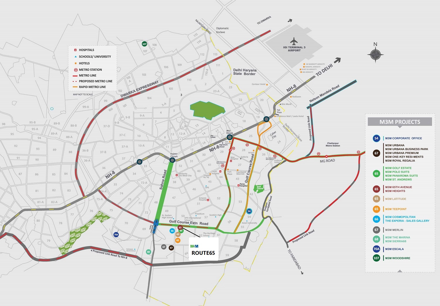 Rapid Metro (Sector 55–56) ~8 min away and Huda City Centre Metro ~10–12 km, enhancing public transport connectivity.