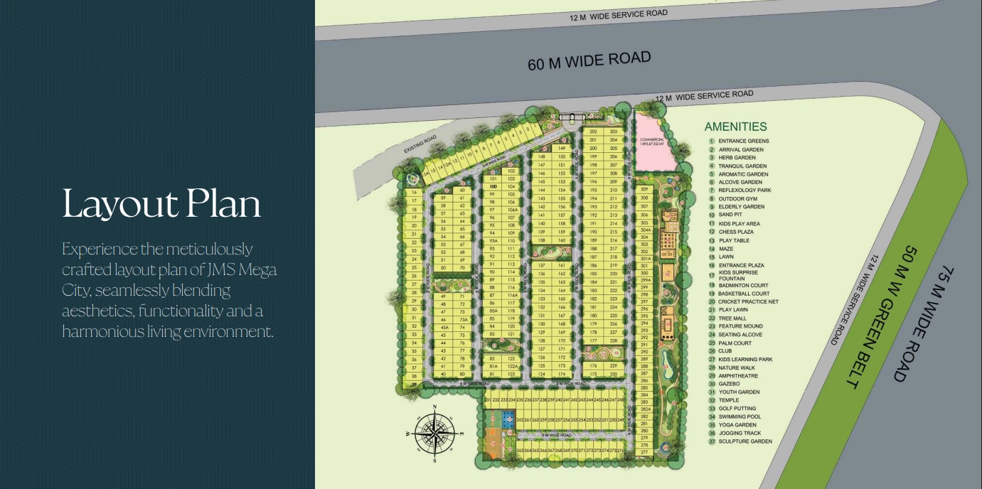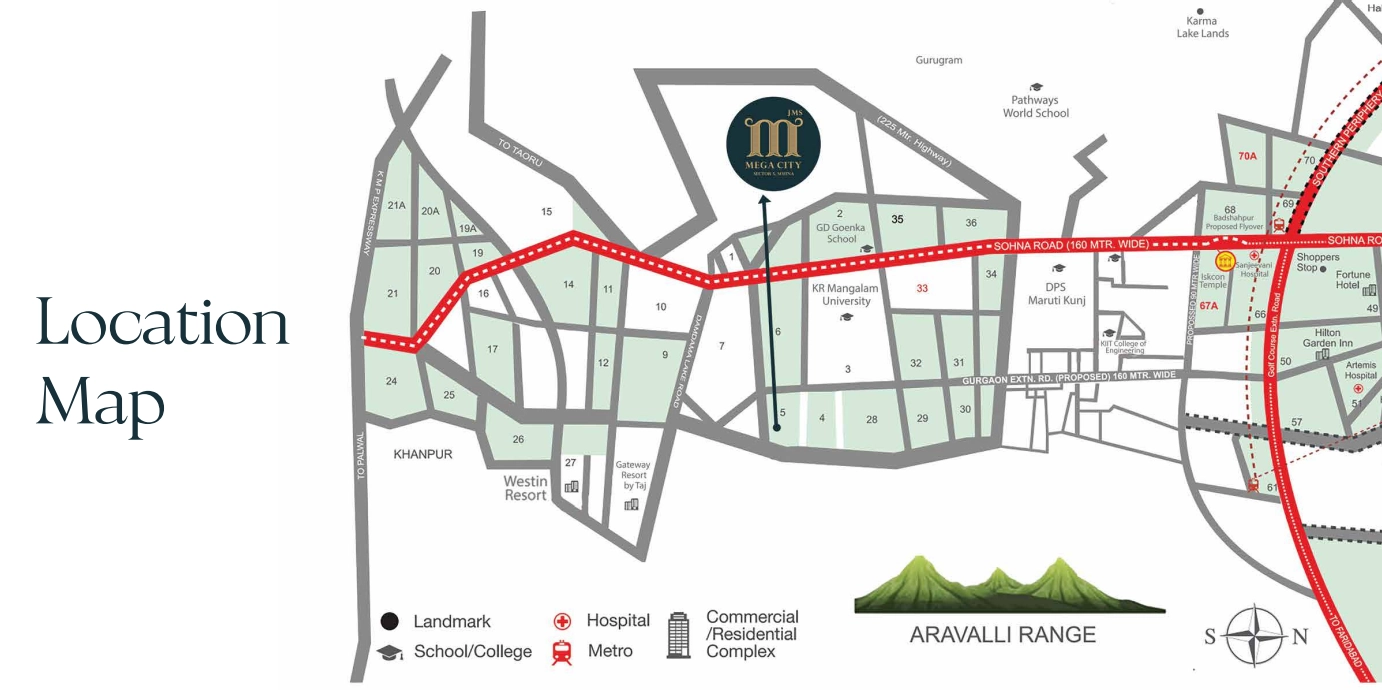 JMS Mega City Plots is a meticulously planned residential plotted development located in Sector 5, Sohna, Gurugram, developed by JMS Infra Build Pvt. Ltd. Spread across approximately 15.06 acres, the project offers 322 well-laid plots ranging from 120 to 178 sq. yards, designed for constructing independent floors (Stilt + 4). Approved under the Deen Dayal Jan Awas Yojana (DDJAY), it is a RERA-registered project, ensuring transparency and legal security for buyers. The gated community features wide internal roads, landscaped green spaces, and essential infrastructure including water supply, electricity, and drainage. With excellent connectivity to Sohna Road, KMP Expressway, and the DMIC corridor, it offers both lifestyle convenience and long-term investment potential.