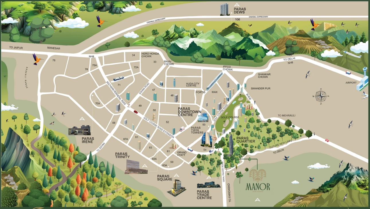 Paras The Manor is an ultra‑luxury residential project by Paras Buildtech located in Sector 2, Gwal Pahari, Gurugram. Spread across approximately 4.26 acres, the development comprises two high‑rise towers with only 120 exclusive 4 BHK residences, each offering expansive layouts of around 4,750 sq ft, private lift lobbies and panoramic views of the Aravalli Hills. Designed with meticulous attention to detail, the project is IGBC Platinum certified, combining architectural excellence with sustainable living features. Residents enjoy a host of premium amenities including a grand triple‑height lobby, world‑class clubhouse, swimming pool, gym, spa and landscaped gardens. Strategically located near Golf Course Road and Gurgaon‑Faridabad Expressway, The Manor balances serenity with excellent urban connectivity and lifestyle convenience.