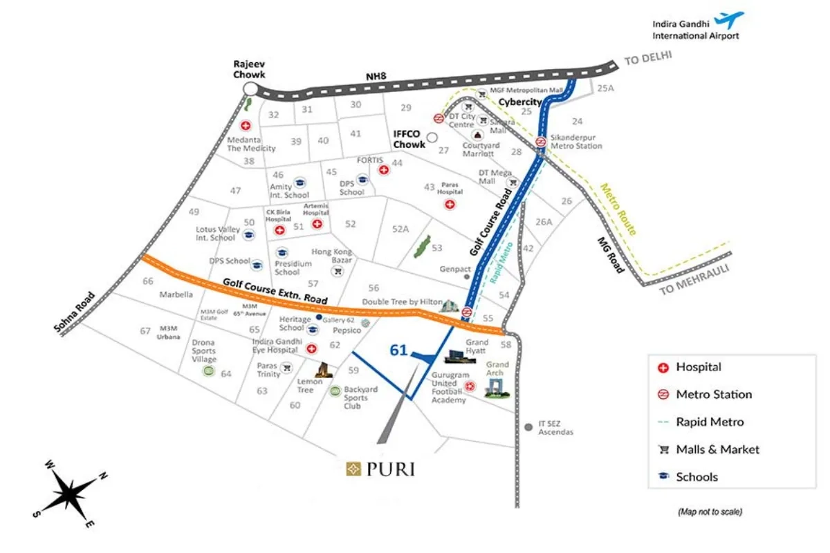 Puri The Aravallis is an upcoming luxury residential project by Puri Constructions, located in Sector 61 on Golf Course Extension Road, Gurugram (Gurgaon). It offers spacious 3 BHK and 4 BHK apartments designed for upscale urban living with views of the Aravalli range and excellent connectivity to major hubs in the city. The community is spread over about 10–10.4 acres, featuring G+40+ towers and around 320 limited residences with premium amenities such as a 50,000 sq ft clubhouse, swimming pool, gym, outdoor courts, landscaped gardens, and 24×7 security in a gated setting. The project is RERA-registered and positioned as a tranquil yet well-connected address on Golf Course Extension Road.