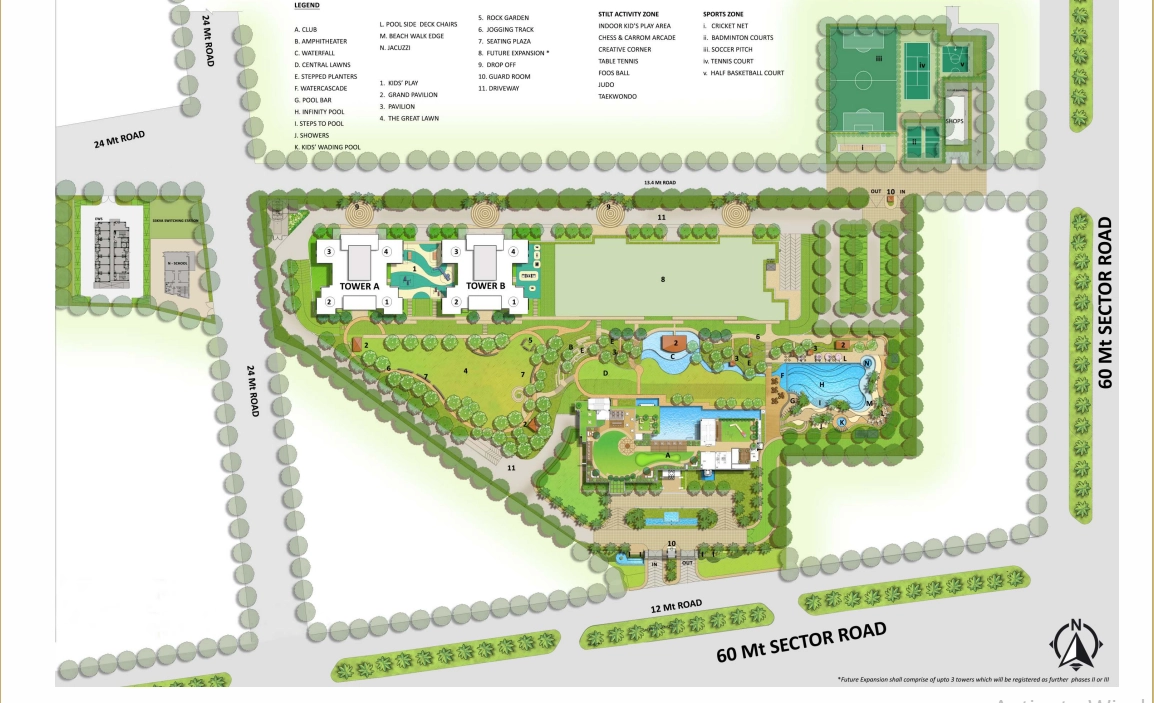 Multiple sports courts, kids’ play areas, and jogging tracks.