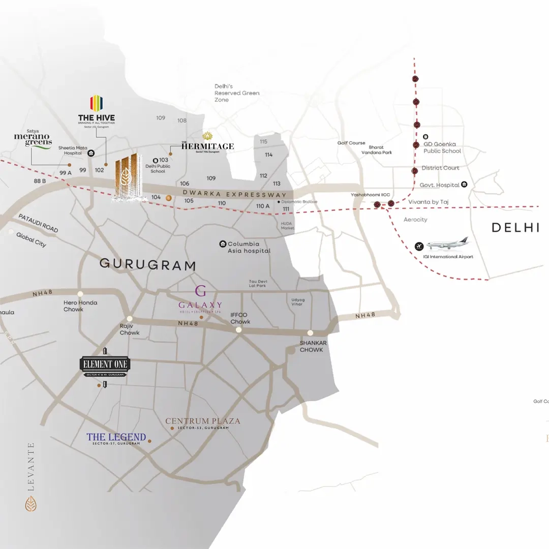 Satya Levante Residences is an ultra-luxury residential development by Satya Group in collaboration with Maple Group, located in Sector 104 on the Dwarka Expressway, Gurugram (Haryana). Spread across approximately 5 acres, the project comprises three high-rise towers rising up to ~47 storeys with just four exclusive apartments per floor, offering 3 BHK, 4 BHK and 5 BHK luxury residences with spacious layouts and premium finishes. Designed for discerning modern families, it blends abundant open green spaces with world-class amenities including a grand clubhouse, swimming pool, gym, spa, children’s play areas, and landscaped gardens, promoting comfort and community living. With excellent connectivity to IGI Airport, NH-48 and upcoming metro stations, Levante promises a luxurious, convenient, and contemporary lifestyle.