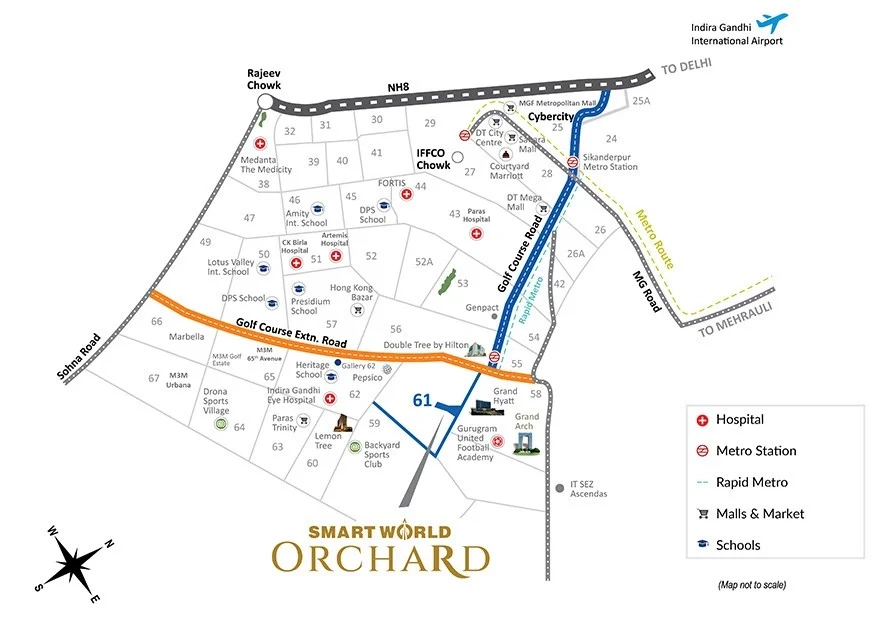 Smart World Orchard is a premium residential development located in Sector 61, Gurugram (Haryana), offering elegant 2.5 BHK and 3 BHK low-rise independent builder floors spread across a sprawling 25-acre gated community. Designed to blend modern comfort with contemporary living, each home features spacious layouts, private terraces, dedicated basement spaces, and smart-living provisions such as VRV/VRF air-conditioning and modular kitchens. Residents enjoy an extensive range of lifestyle amenities including a world-class clubhouse, swimming pool, gymnasium, sports courts, jogging tracks and landscaped parks, complemented by 24Γ7 security and power backup. Strategically positioned opposite The Grand Hyatt on Golf Course Extension Road, the project offers excellent connectivity to key NCR hubs, metro stations, schools and healthcare centres, making it ideal for families and long-term investors alike.