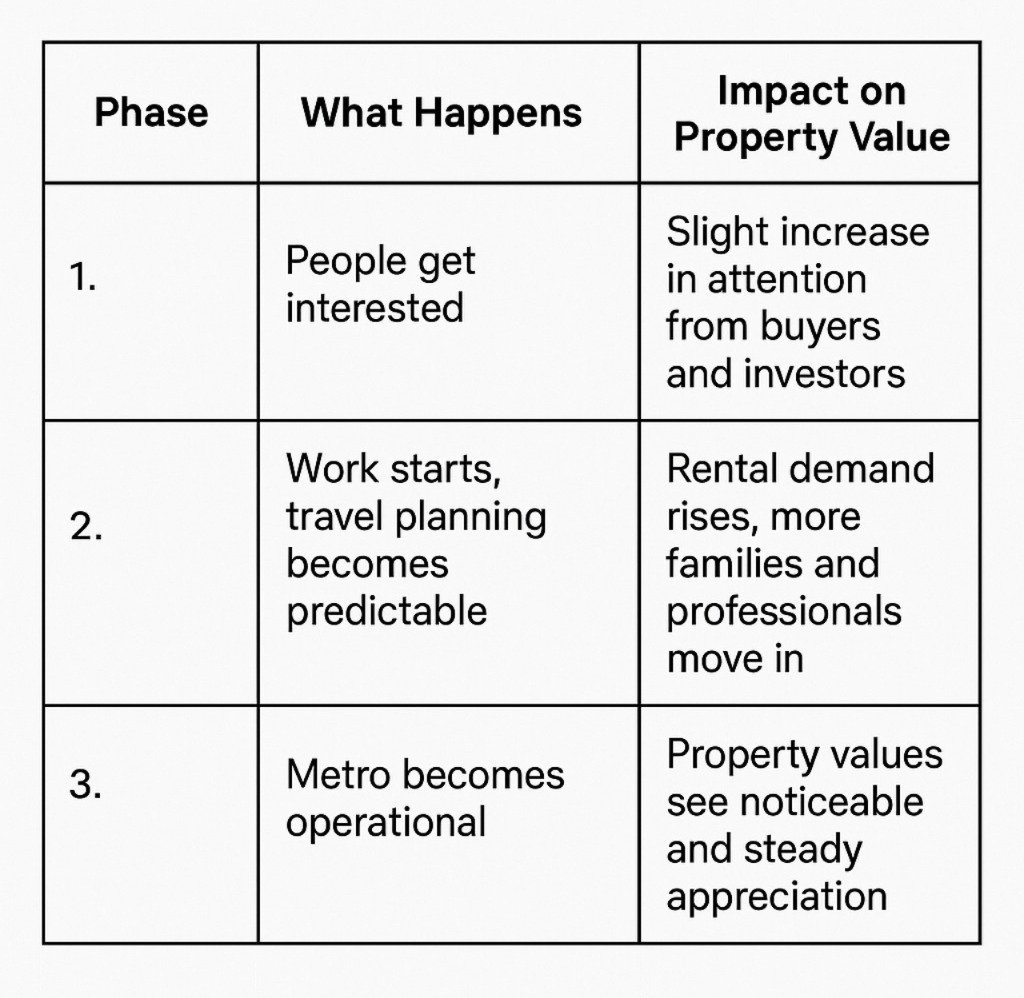 The government is investing ₹5,500 crore to build this new metro route. This big investment means the route will be well developed with modern stations, tracks, and transport facilities.This metro line will improve connectivity, making travel easier and faster. As a result, property demand, rental value, and real estate prices in the nearby areas are expected to increase. This metro project will boost development and make the connected areas more valuable and desirable for living and investment.Whenever a new metro line is announced, the real estate market reacts in phases: