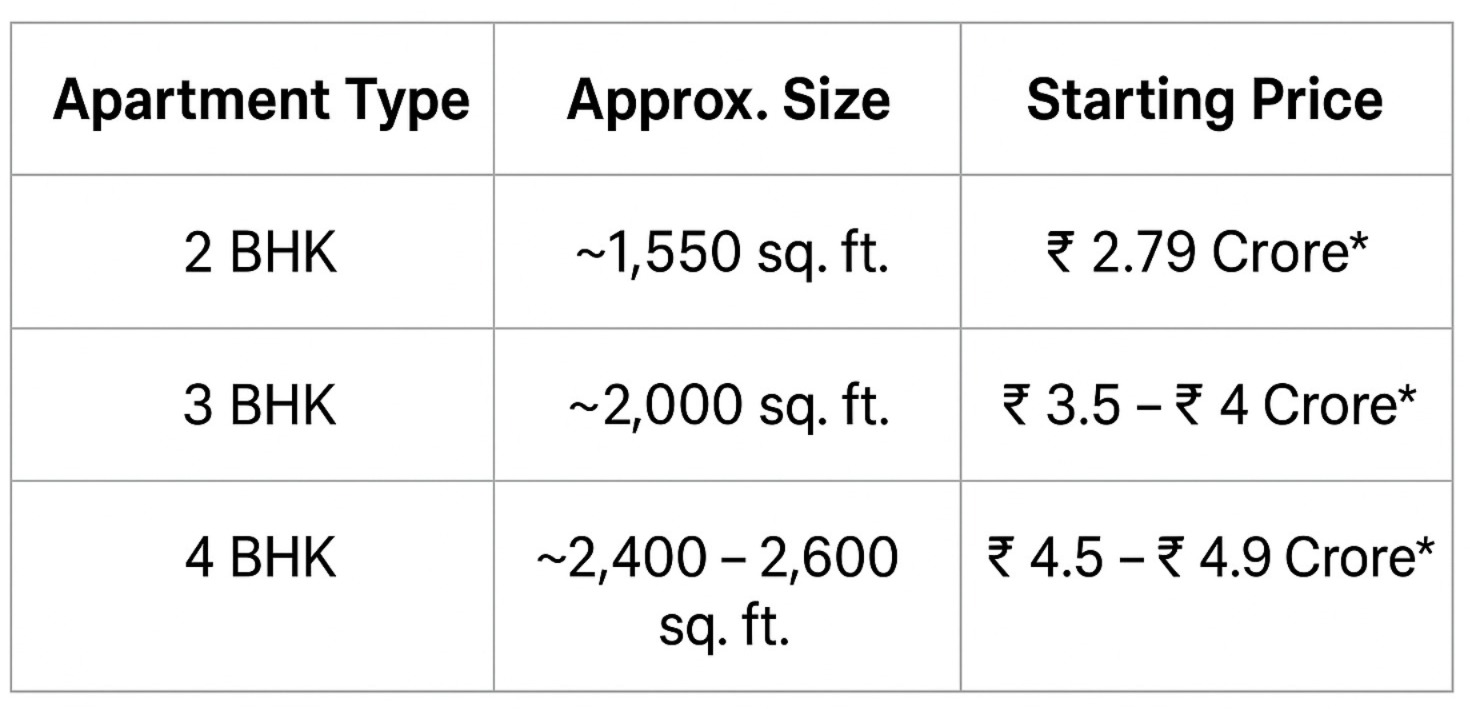 Indicative pricing starts from around ₹2.79 crore and can go up to ₹4.8 crore depending on the apartment type.